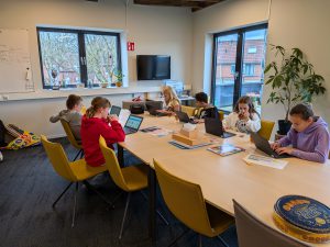 De kinderredactie is hard aan het werk, lekker met een kopje thee.